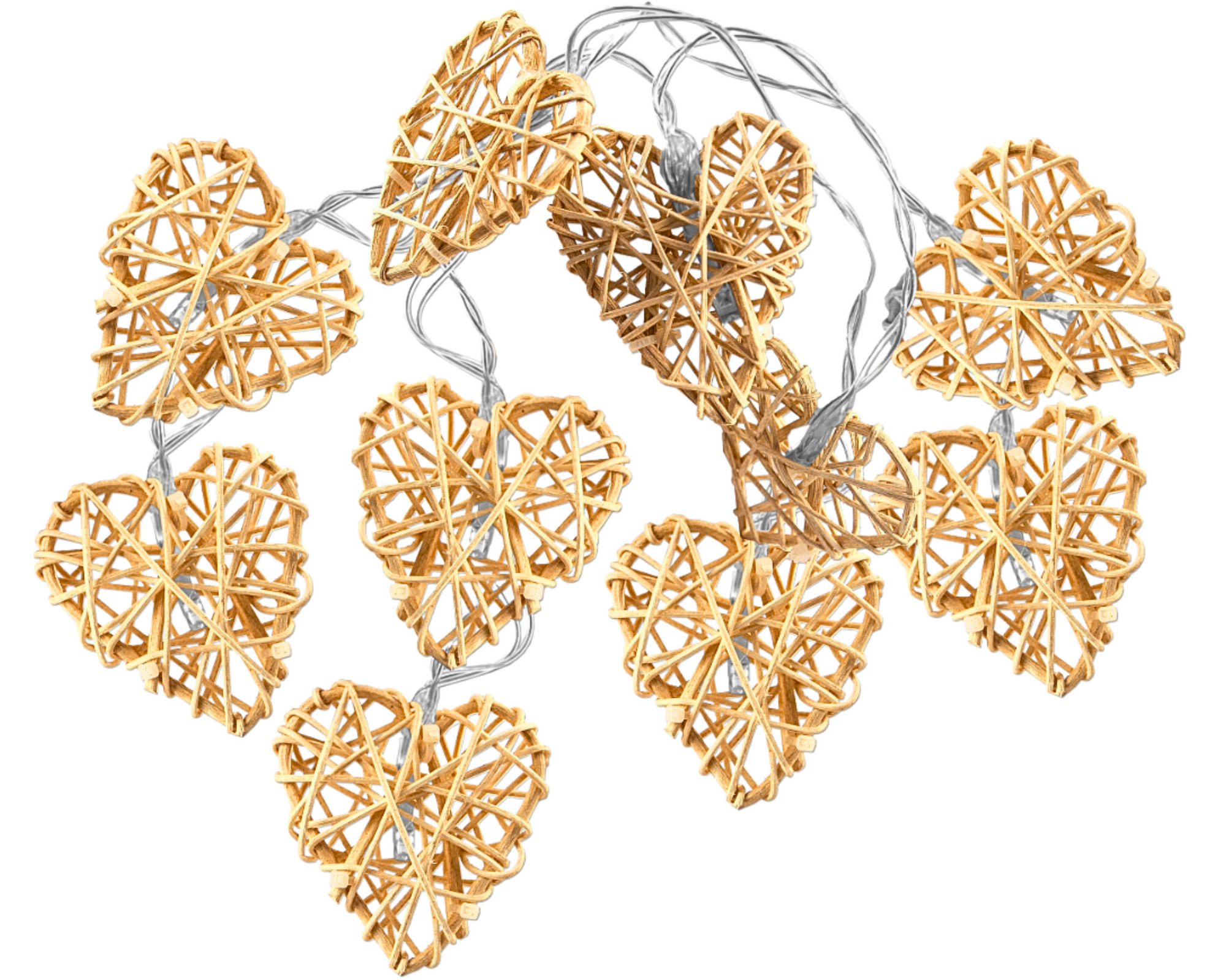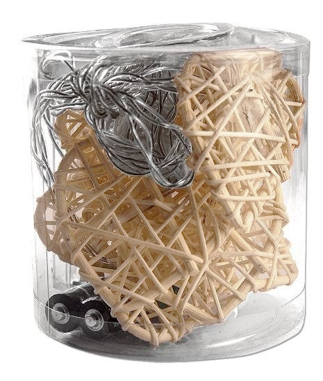 Zestaw dekoracyjnych ratanowych serc jest wyposażony w lampki LED na przezroczystym kablu.