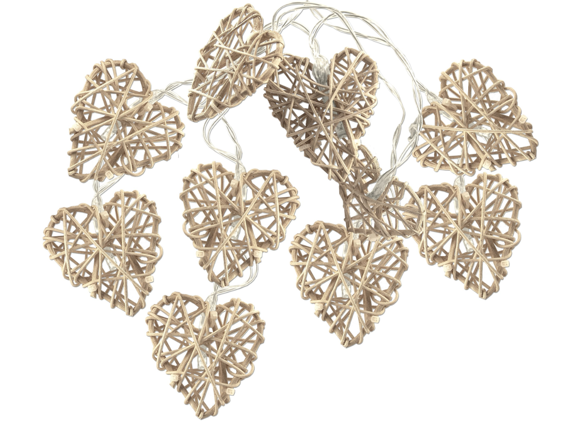 Zestaw dekoracyjnych ratanowych serc jest wyposażony w lampki LED na przezroczystym kablu.