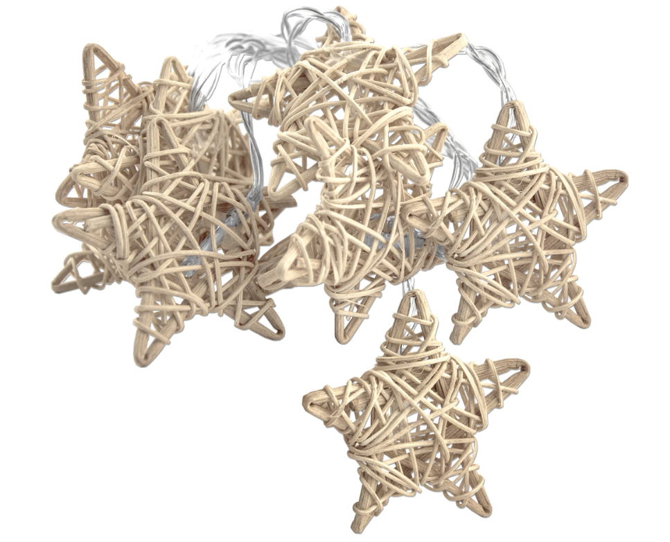 Zestaw dekoracyjnych ratanowych gwiazdek jest wyposażony w lampki LED na przezroczystym kablu.
