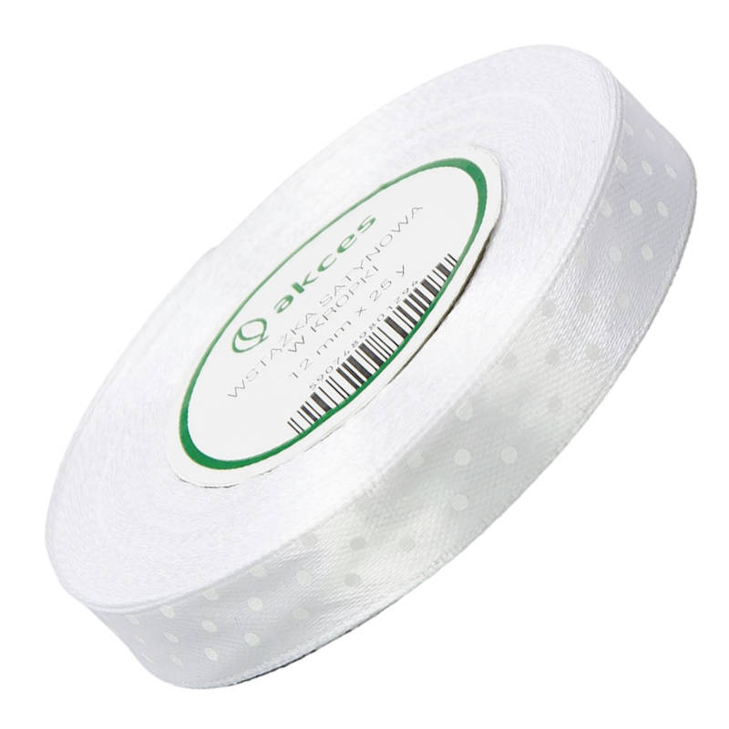 Wstążka satynowa biała w białe kropki 12mm 23m