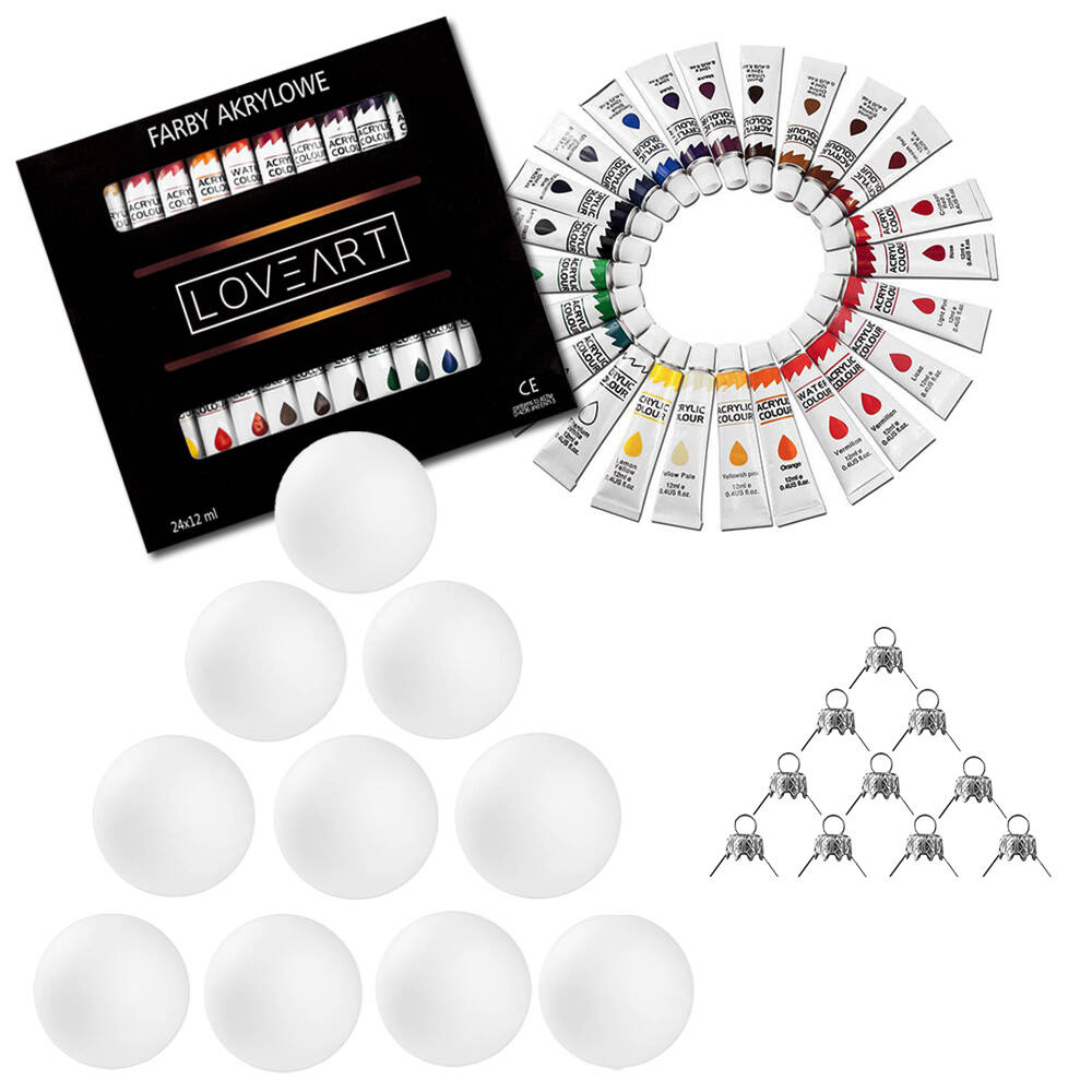 Zestaw zawierający bombki styropianowe, farby oraz zawieszki.