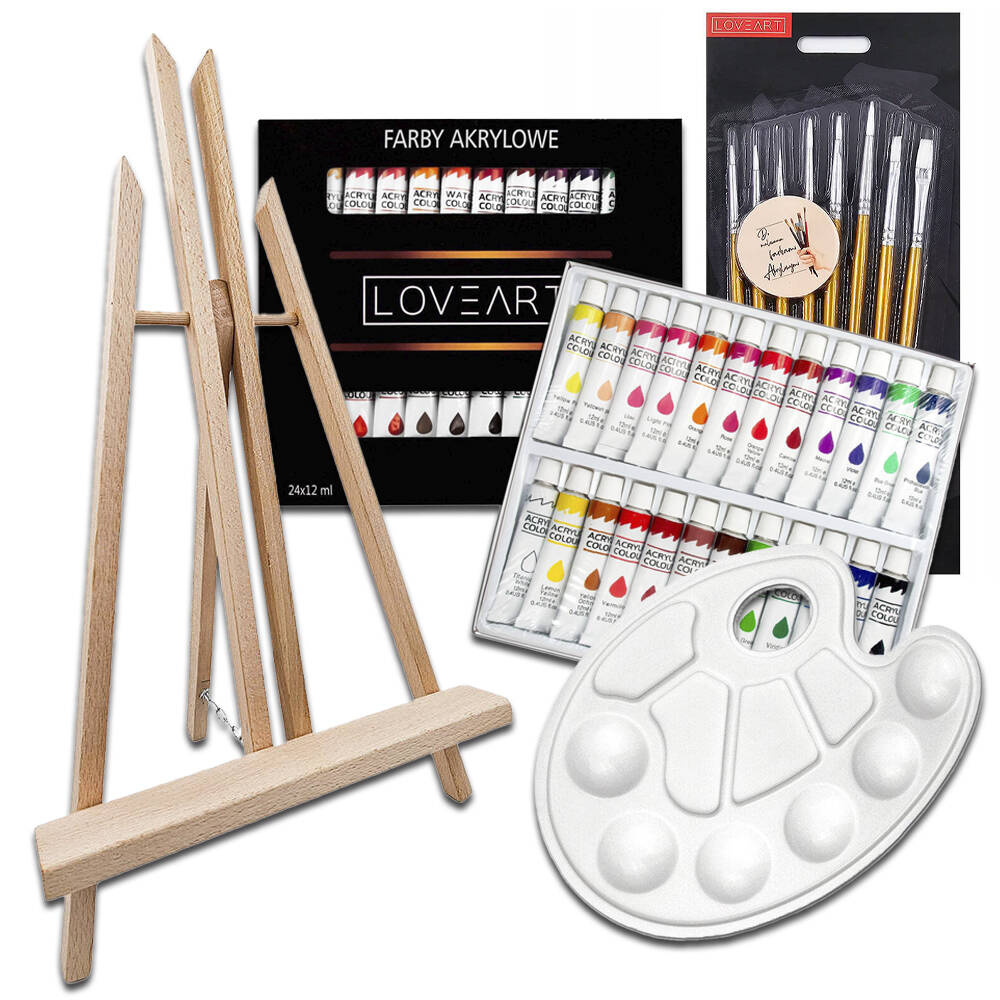 Sztaluga malarska stołowa wykonana jest z drewna bukowego o wysokości 50cm. Zestaw farb akrylowych Loveart zawiera 24 kolory, każdy o pojemności 12ml. W zestawie znajdują się również pędzle przeznaczone do malowania farbami akrylowymi - okrągłe i płaskie. Paletka malarska jest wykonana z plastiku a jej wymiary to 17x24cm. Idealnie nada się do mieszania kolorów farb ze sobą. Połączenie ze sobą tych produktów w zestaw jest kreatywnym pomysłem na prezent. Dzięki swojej kompaktowej konstrukcji jest idealny do prac na małych przestrzeniach, takich jak biurko czy stół. Dzięki niemu malowanie może stać się Twoją pasją na całe życie. Zestaw nadaje się zarówno dla amatorów jak i profesjonalistów.