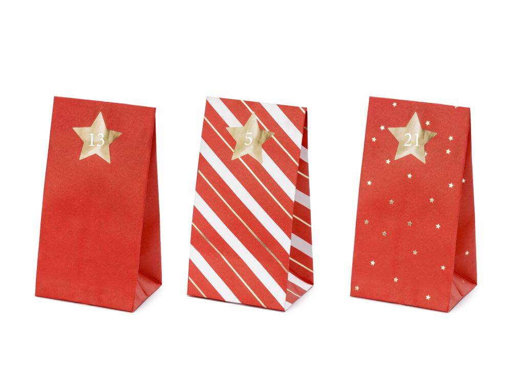 Zestaw zawiera: 3 wzory papierowych torebek w kolorze czerwonym (2 wzory mają złoty metalizowany nadruk), po 8 z każdego wzoru i 24 złote naklejki z białym nadrukiem numerów od 1 do 24.