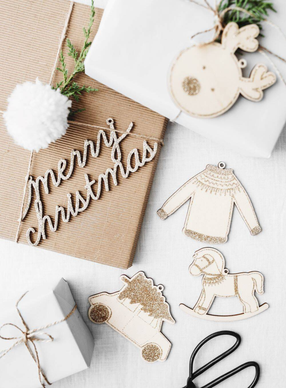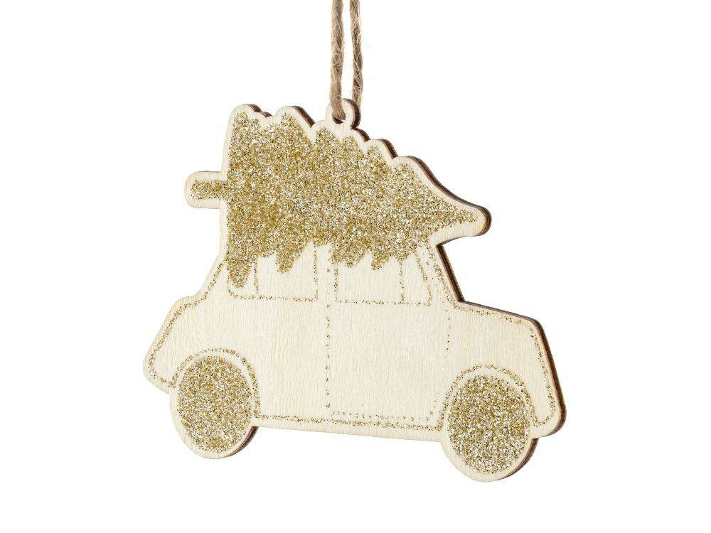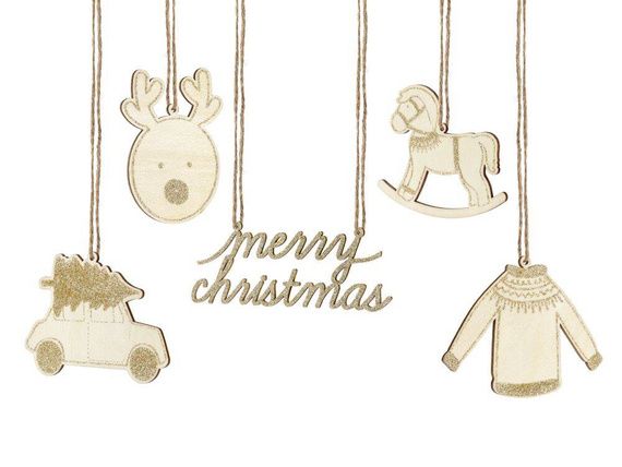 Zawieszki dekoracyjne "Święta" wykonane są z drewna ze złotym brokatem z jednej strony.