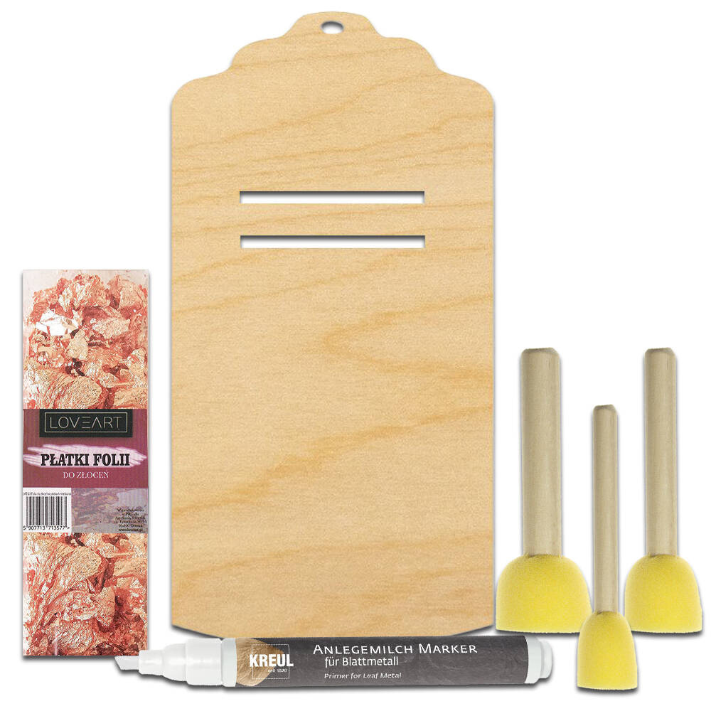 Drewniana podkładka pod kalendarz wykonana jest ze sklejki liściastej o grubości 3mm. Ozdobiona folią do złoceń w kolorze miedzianym zawartą w zestawie będzie świetnie się prezentować na ścianie w Twoim domu. Jest idealna do zdobienia techniką decoupage. Można na nią także naklejać przy pomocy pistoletu na gorąco lub zwykłego kleju introligatorskiego przeróżne ozdoby: piórka, koraliki, etc. Jej wymiary to 26cm x 14cm. Do zestawu dołączony jest także pisak ze specjalnym klejem służący do przyklejania folii oraz płatków metalu. Doskonale się nadaje do precyzyjnych prac. Końcówka pozwala na rysowanie różnej grubości linii - od 2 do 5 mm. Klej nakłada się na oczyszczoną i odtłuszczoną powierzchnię. Po odczekaniu aż klej nieco przeschnie, można nałożyć folię. Pędzle gąbkowe o średnicy 2, 3 i 4cm, które również są dołączone do zestawu będą idealnie się nadawać do nanoszenia oraz przyklejania płatków folii do powierzchni podkładki.