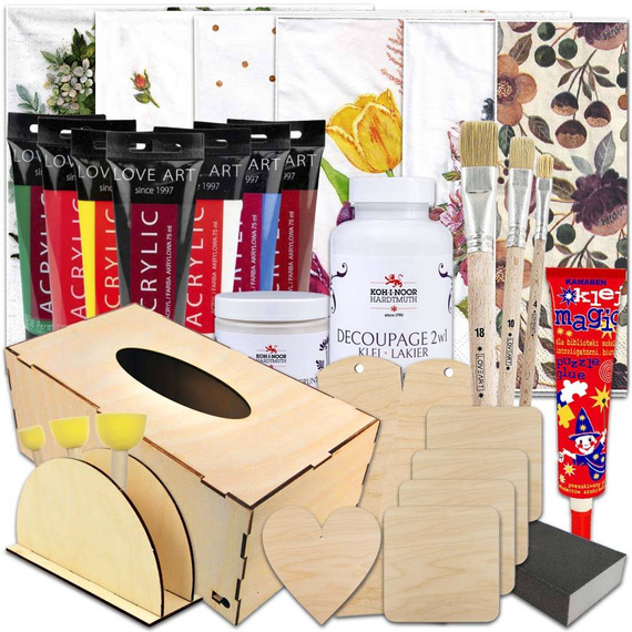 Chcesz rozpocząć swoją przygodę z decoupage? Nie wiesz od czego zacząć i jakie produkty będą Ci potrzebne? W związku z tym przygotowaliśmy dla Ciebie idealny zestaw z którym możesz rozpocząć swoją przygodę z ozdabianiem przedmiotów. Ten zestaw startowy do decoupage zawiera produkty, które pomogą Ci ozdobić drewniany chustecznik, serwetnik oraz inne drewniane ozdoby. Takie pięknie ozdobione pudełko może stanowić unikalną dekorację w Twoim domu bądź być kreatywną alternatywą na prezent dla bliskiej Ci osoby. Decoupage może stać się Twoją pasją i ciekawym sposobem na spędzanie wolnego czasu.