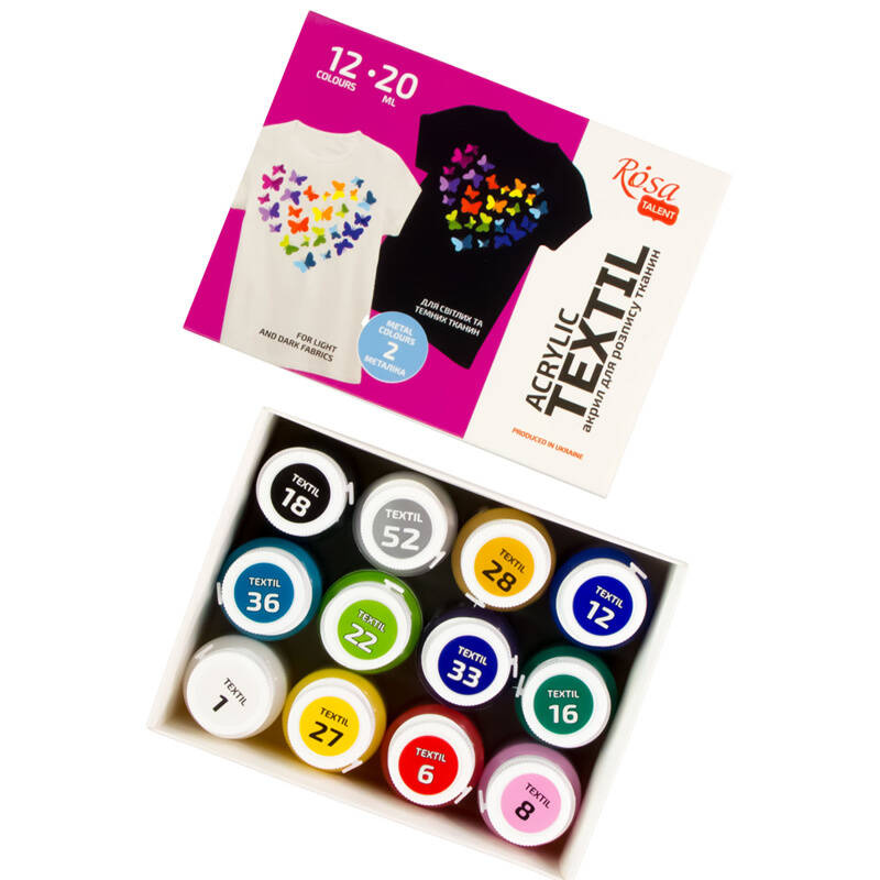 Farby akrylowe do tkanin o wysokiej pigmentacji, każda o pojemności 20ml. Przeznaczone do malowania na jasnych jak i ciemnych tkaninach, takich jak bawełna, skóra, czy zamsz. Posiadają bardzo dobre krycie, dzięki czemu nadają się także do typowo artystycznego malarstwa tkaninowego. Kremowa konsystencja i odpowiednia kompozycja składników sprawiają, że farby świetnie radzą sobie na tkaninach elastycznych. Aby utrwalić farby, należy prasować tkaninę przez 5 minut. Jeżeli prasowanie jest niemożliwe można wstawić do piekarnika na 20 minut do temperatury 120 C. Po utrwalaniu odczekać 48 godzin przed ewentualnym praniem.