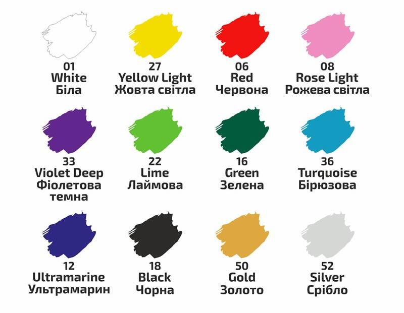 - Kolory: biały, żółty, czerwony, różowy, fioletowy, limonkowy, turkusowy, zielony, ultramaryna, czarny, złoty, srebrny