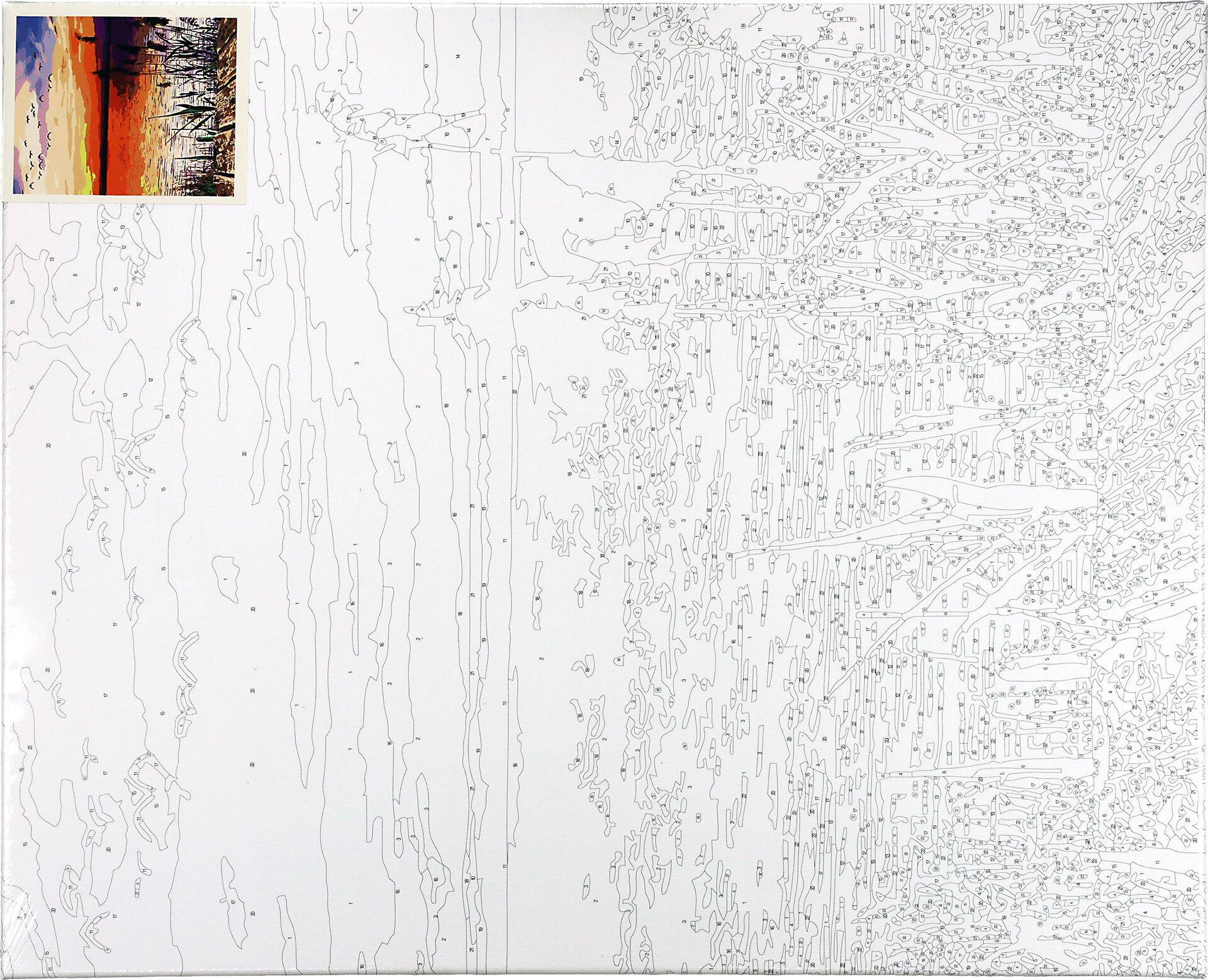 Płótno z nadrukiem – Na płótnie znajduje się nadrukowany obraz podzielony na obszary, z których każdy oznaczony jest numerem. Każdy numer odpowiada konkretnemu kolorowi farby.