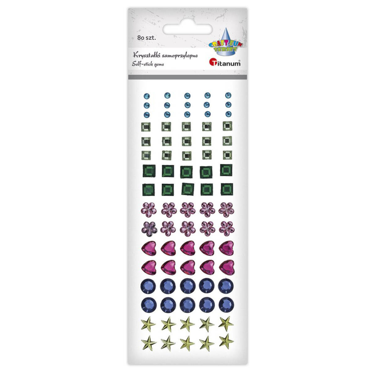 Kryształki samoprzylepne o różnych kształtach i kolorach umieszczone są na blistrze zawierającym 80szt. Te eleganckie i subtelne ozdoby wprowadzą do każdego projektu nieco blasku i uroku.