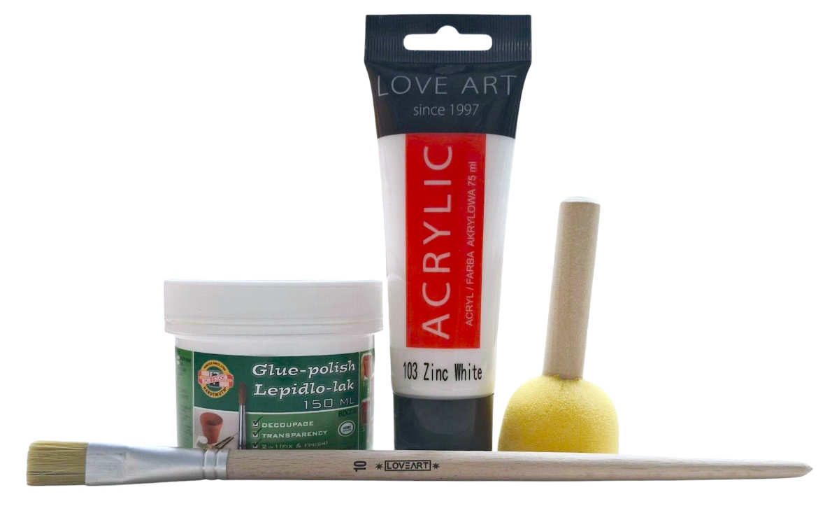 1. Należy odpowiednio przygotować powierzchnię przedmiotów, które będą bazą do zdobień. Pomaluj powierzchnię białą farbą akrylową. Jedna warstwa powinna być wystarczająca w przypadku jasnych przedmiotów.